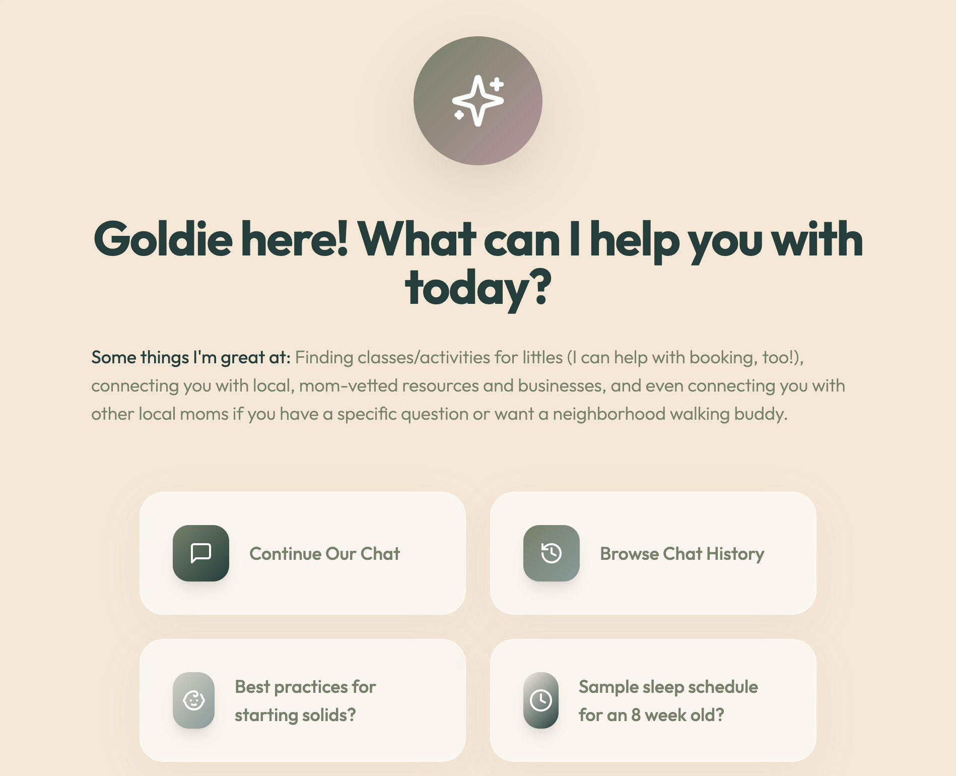 We’re building Goldie—an app that eases the mental load of mothering. By combining human insight with thoughtful, intelligent solutions, we’re building the kind of support system families truly need.
